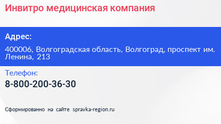 Инвитро, медицинская компания по адресу 400006, Волгоградская область, Волгоград, проспект им. Ленина, 213 в дальнейшем Организация, размещена в следующих категориях:
