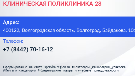 КЛИНИЧЕСКАЯ ПОЛИКЛИНИКА № 28 по адресу 400122, Волгоградская область, Волгоград, Байдакова, 10а в дальнейшем Организация, размещена в следующих категориях: