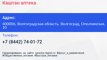 Каштан, аптека по адресу 400006, Волгоградская область, Волгоград, Ополченская, 10 в дальнейшем Организация, размещена в следующих категориях: