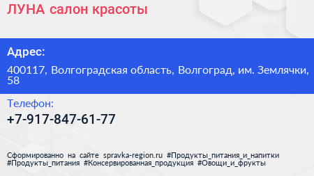ЛУНА, салон красоты по адресу 400117, Волгоградская область, Волгоград, им. Землячки, 58 в дальнейшем Организация, размещена в следующих категориях: