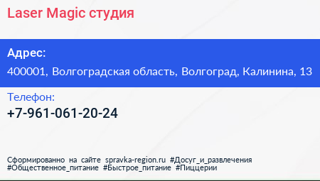 Laser Magic, студия по адресу 400001, Волгоградская область, Волгоград, Калинина, 13 в дальнейшем Организация, размещена в следующих категориях: