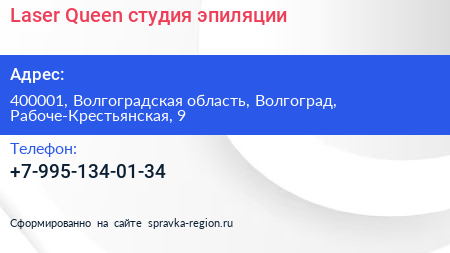 Laser Queen, студия эпиляции по адресу 400001, Волгоградская область, Волгоград, Рабоче-Крестьянская, 9 в дальнейшем Организация, размещена в следующих категориях: