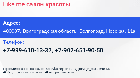 Like me, салон красоты по адресу 400087, Волгоградская область, Волгоград, Невская, 11а в дальнейшем Организация, размещена в следующих категориях: