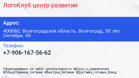 ЛогоКлуб, центр развития по адресу 400082, Волгоградская область, Волгоград, 50 лет Октября, 40 в дальнейшем Организация, размещена в следующих категориях: