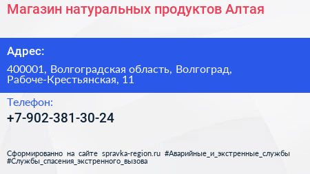 Магазин натуральных продуктов Алтая по адресу 400001, Волгоградская область, Волгоград, Рабоче-Крестьянская, 11 в дальнейшем Организация, размещена в следующих категориях: