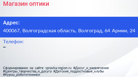 Магазин оптики по адресу 400067, Волгоградская область, Волгоград, 64 Армии, 24 в дальнейшем Организация, размещена в следующих категориях: