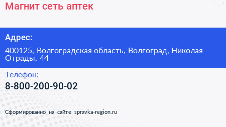 Магнит, сеть аптек по адресу 400125, Волгоградская область, Волгоград, Николая Отрады, 44 в дальнейшем Организация, размещена в следующих категориях: