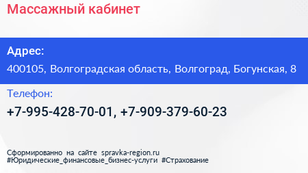 Массажный кабинет по адресу 400105, Волгоградская область, Волгоград, Богунская, 8 в дальнейшем Организация, размещена в следующих категориях: