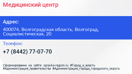 Медицинский центр по адресу 400074, Волгоградская область, Волгоград, Социалистическая, 20 в дальнейшем Организация, размещена в следующих категориях: