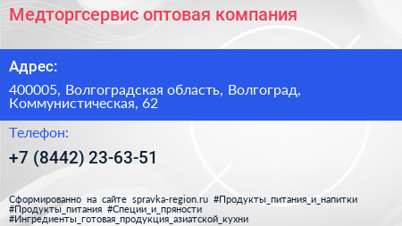 Медторгсервис, оптовая компания по адресу 400005, Волгоградская область, Волгоград, Коммунистическая, 62 в дальнейшем Организация, размещена в следующих категориях: