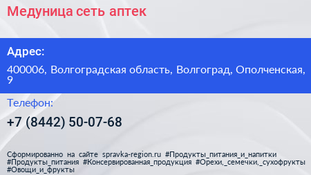 Медуница, сеть аптек по адресу 400006, Волгоградская область, Волгоград, Ополченская, 9 в дальнейшем Организация, размещена в следующих категориях: