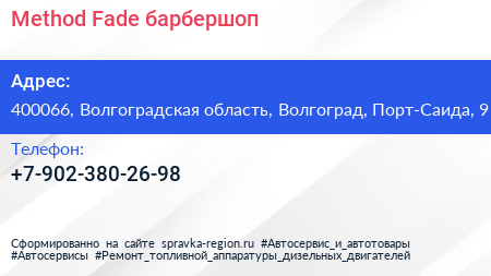Method Fade, барбершоп по адресу 400066, Волгоградская область, Волгоград, Порт-Саида, 9 в дальнейшем Организация, размещена в следующих категориях: