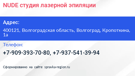 NUDE, студия лазерной эпиляции по адресу 400121, Волгоградская область, Волгоград, Кропоткина, 1а в дальнейшем Организация, размещена в следующих категориях: