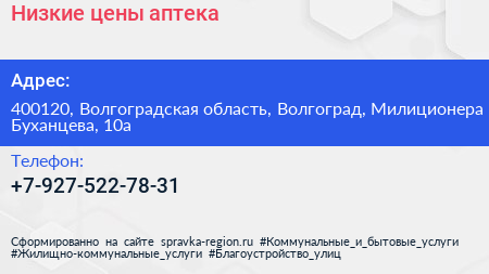 Низкие цены, аптека по адресу 400120, Волгоградская область, Волгоград, Милиционера Буханцева, 10а в дальнейшем Организация, размещена в следующих категориях: