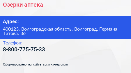 Озерки, аптека по адресу 400123, Волгоградская область, Волгоград, Германа Титова, 36 в дальнейшем Организация, размещена в следующих категориях: