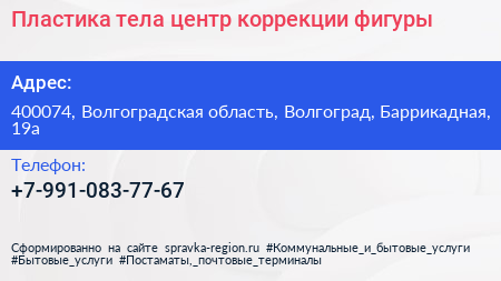 Пластика тела, центр коррекции фигуры по адресу 400074, Волгоградская область, Волгоград, Баррикадная, 19а в дальнейшем Организация, размещена в следующих категориях: