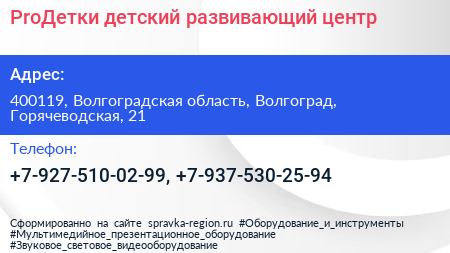 ProДетки, детский развивающий центр по адресу 400119, Волгоградская область, Волгоград, Горячеводская, 21 в дальнейшем Организация, размещена в следующих категориях: