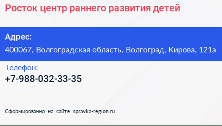 Росток, центр раннего развития детей по адресу 400067, Волгоградская область, Волгоград, Кирова, 121а в дальнейшем Организация, размещена в следующих категориях: