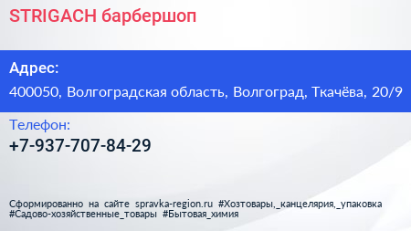 STRIGACH, барбершоп по адресу 400050, Волгоградская область, Волгоград, Ткачёва, 20/9 в дальнейшем Организация, размещена в следующих категориях: