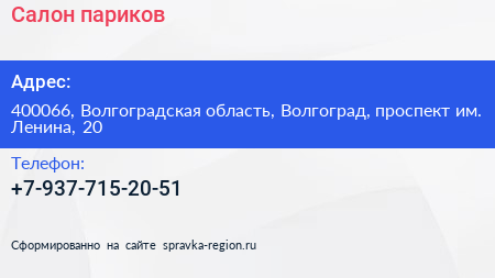 Салон париков по адресу 400066, Волгоградская область, Волгоград, проспект им. Ленина, 20 в дальнейшем Организация, размещена в следующих категориях: