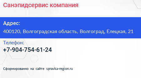 Санэпидсервис, компания по адресу 400120, Волгоградская область, Волгоград, Елецкая, 21 в дальнейшем Организация, размещена в следующих категориях: