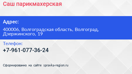 Саш, парикмахерская по адресу 400006, Волгоградская область, Волгоград, Дзержинского, 19 в дальнейшем Организация, размещена в следующих категориях: