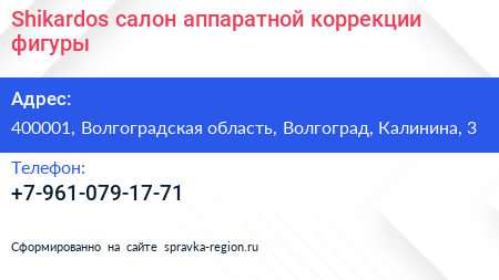 Shikardos, салон аппаратной коррекции фигуры по адресу 400001, Волгоградская область, Волгоград, Калинина, 3 в дальнейшем Организация, размещена в следующих категориях: