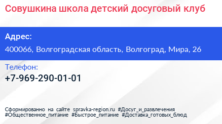 Совушкина школа, детский досуговый клуб по адресу 400066, Волгоградская область, Волгоград, Мира, 26 в дальнейшем Организация, размещена в следующих категориях: