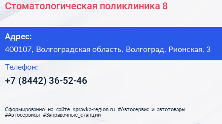 Стоматологическая поликлиника №8 по адресу 400107, Волгоградская область, Волгоград, Рионская, 3 в дальнейшем Организация, размещена в следующих категориях:
