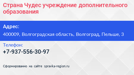Страна Чудес, учреждение дополнительного образования по адресу 400009, Волгоградская область, Волгоград, Пельше, 3 в дальнейшем Организация, размещена в следующих категориях: