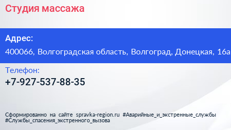 Студия массажа по адресу 400066, Волгоградская область, Волгоград, Донецкая, 16а в дальнейшем Организация, размещена в следующих категориях: