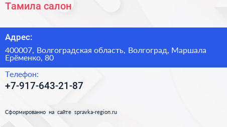 Тамила, салон по адресу 400007, Волгоградская область, Волгоград, Маршала Ерёменко, 80 в дальнейшем Организация, размещена в следующих категориях: