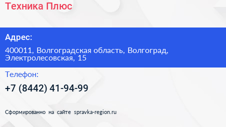 Техника Плюс по адресу 400011, Волгоградская область, Волгоград, Электролесовская, 15 в дальнейшем Организация, размещена в следующих категориях: