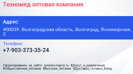 Техномед, оптовая компания по адресу 400039, Волгоградская область, Волгоград, Ясноморская, 2 в дальнейшем Организация, размещена в следующих категориях: