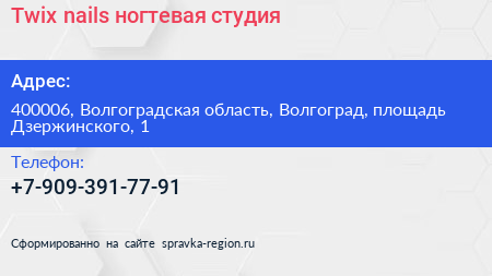 Twix nails, ногтевая студия по адресу 400006, Волгоградская область, Волгоград, площадь Дзержинского, 1 в дальнейшем Организация, размещена в следующих категориях: