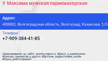 У Максима, мужская парикмахерская по адресу 400002, Волгоградская область, Волгоград, Казахская, 1/5 в дальнейшем Организация, размещена в следующих категориях: