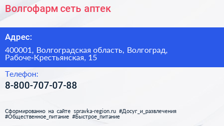 Волгофарм, сеть аптек по адресу 400001, Волгоградская область, Волгоград, Рабоче-Крестьянская, 15 в дальнейшем Организация, размещена в следующих категориях: