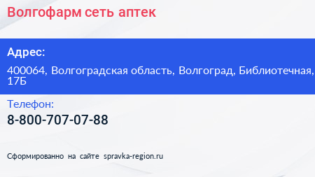 Волгофарм, сеть аптек по адресу 400064, Волгоградская область, Волгоград, Библиотечная, 17Б в дальнейшем Организация, размещена в следующих категориях:
