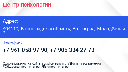 Центр психологии по адресу 404110, Волгоградская область, Волгоград, Молодёжная, 3 в дальнейшем Организация, размещена в следующих категориях: