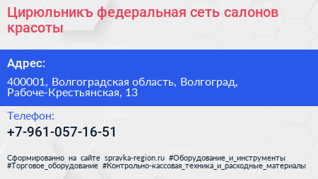 Цирюльникъ, федеральная сеть салонов красоты по адресу 400001, Волгоградская область, Волгоград, Рабоче-Крестьянская, 13 в дальнейшем Организация, размещена в следующих категориях: