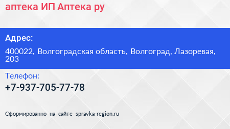 аптека, ИП Аптека ру по адресу 400022, Волгоградская область, Волгоград, Лазоревая, 203 в дальнейшем Организация, размещена в следующих категориях: