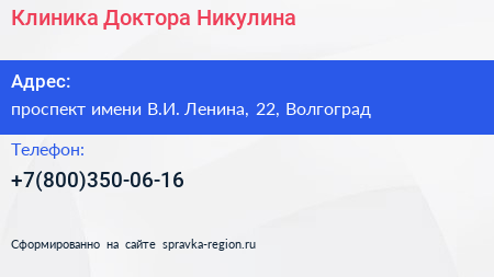 Клиника Доктора Никулина по адресу проспект имени В.И. Ленина, 22, Волгоград в дальнейшем Организация, размещена в следующих категориях: