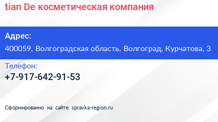 tian De, косметическая компания по адресу 400059, Волгоградская область, Волгоград, Курчатова, 3 в дальнейшем Организация, размещена в следующих категориях: