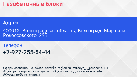 Газобетонные блоки по адресу 400012, Волгоградская область, Волгоград, Маршала Рокоссовского, 29Б в дальнейшем Организация, размещена в следующих категориях: