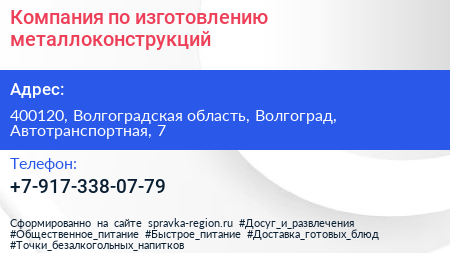 Компания по изготовлению металлоконструкций по адресу 400120, Волгоградская область, Волгоград, Автотранспортная, 7 в дальнейшем Организация, размещена в следующих категориях:
