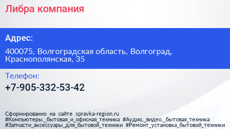 Либра, компания по адресу 400075, Волгоградская область, Волгоград, Краснополянская, 35 в дальнейшем Организация, размещена в следующих категориях: