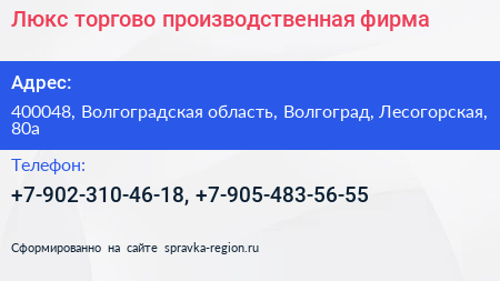 Люкс, торгово-производственная фирма по адресу 400048, Волгоградская область, Волгоград, Лесогорская, 80а в дальнейшем Организация, размещена в следующих категориях: