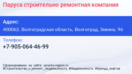 Паруса, строительно-ремонтная компания по адресу 400062, Волгоградская область, Волгоград, Зевина, 96 в дальнейшем Организация, размещена в следующих категориях: