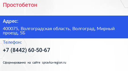 Простобетон по адресу 400075, Волгоградская область, Волгоград, Мирный проезд, 5Б в дальнейшем Организация, размещена в следующих категориях: