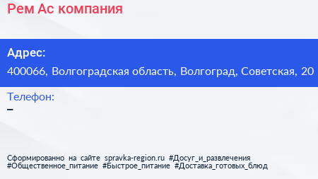 Рем-Ас, компания по адресу 400066, Волгоградская область, Волгоград, Советская, 20 в дальнейшем Организация, размещена в следующих категориях: